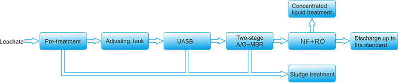 Based on those features, requirements of processing technology and facility become much higher. The process of" Pre-treatment + UASB + two-stage A/O-MBR + NF + RO " can ensure the higher removal of total nitrogen and organic pollutants, which can guarantee the leachate stably up to standard with reliable operation.